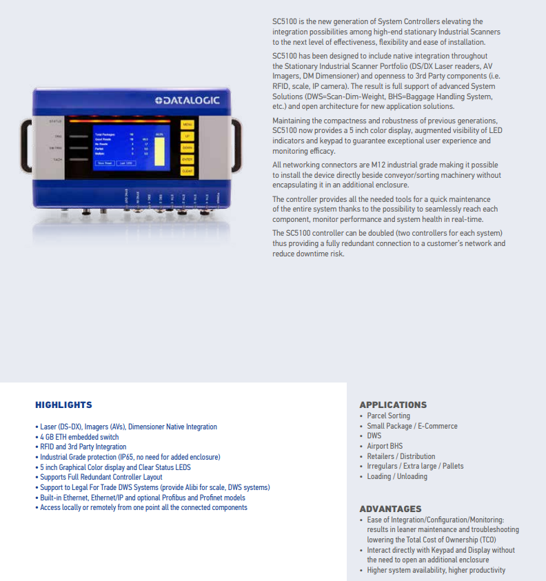 得利捷SC5100固定式工業系統控制器的設計包含了整個固定式工業掃描器組合(DS/DX系列激光閱讀器、AV系列掃描器、DM系列體積測量儀)的本公司產品集成,且支持第三方組件(如RFID、秤、網絡相機)的集成開放接口。其結果是完全支持的系統解決方案(DWS=Scan-Dim-Weight,BHS=Baggage Handling等),并為新的應用解決方案提供